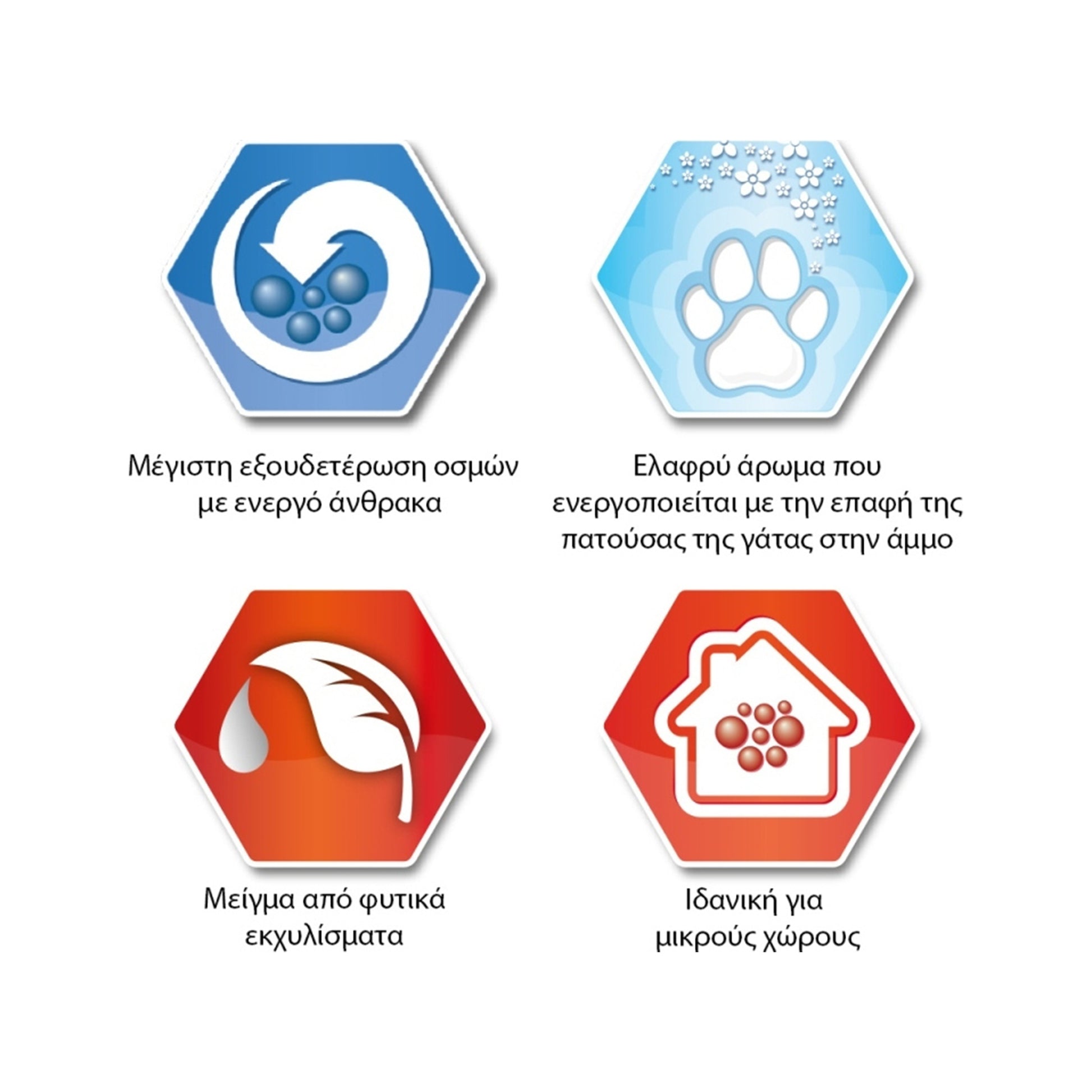 Αυτοσυγκολλούμενη άμμος γάτας με δυνατότητα πολύ ισχυρής εξάλειψης οσμών, ιδανική για μικρούς χώρους.