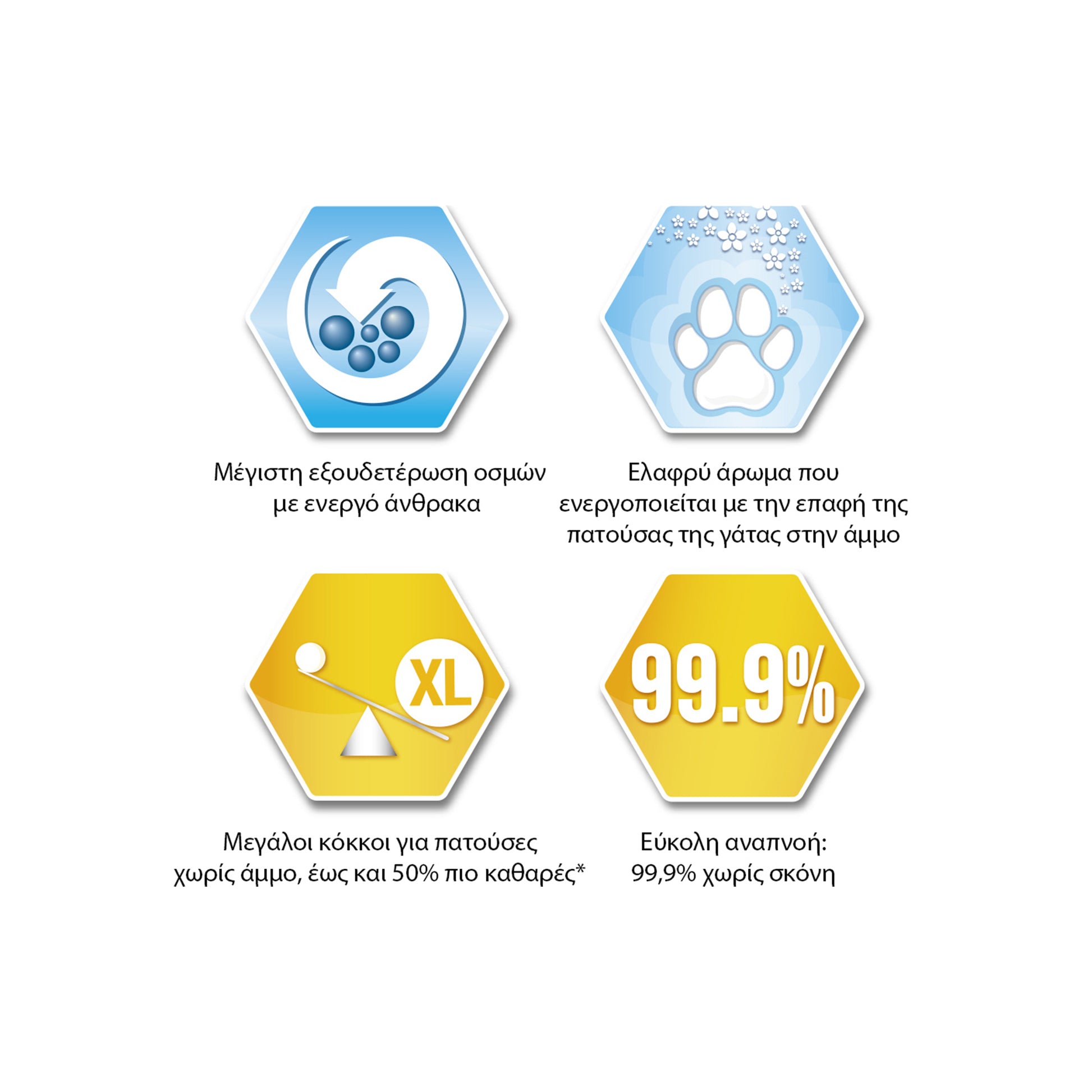 Αυτοσυγκολλούμενη άμμος για όλες τις γάτες, με φρέσκο άρωμα λουλουδιών.