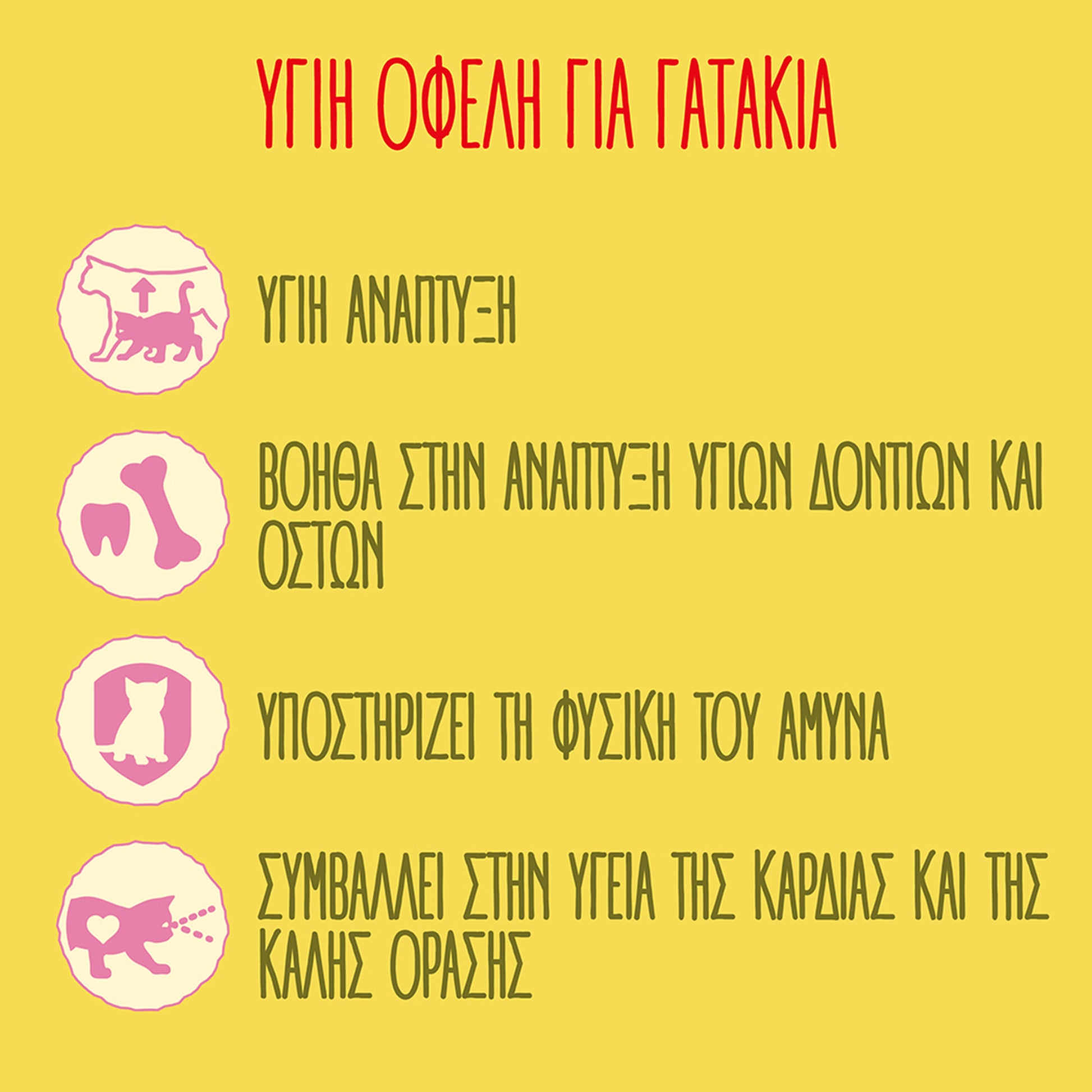 Πλήρης ξηρή τροφή για γατάκια έως 1 έτους και έγκυες ή θηλάζουσες γάτες. Με κοτόπουλο, γάλα και πρόσθετα λαχανικά.