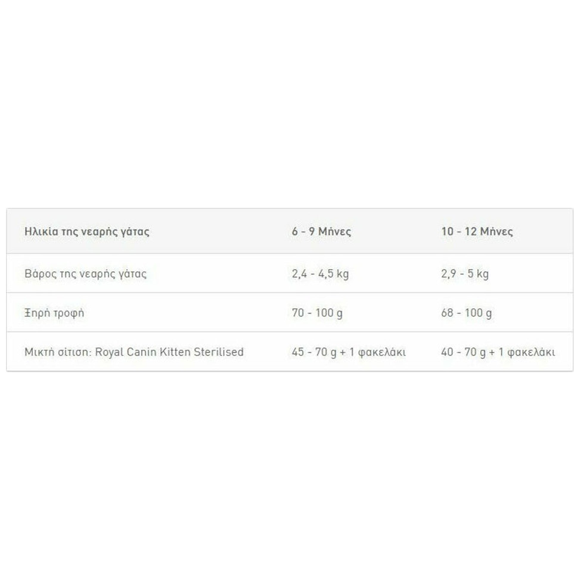 Μετά τη στείρωση, οι ενεργειακές ανάγκες της νεαρής γάτας αλλάζουν και αυξάνεται ο κίνδυνος αύξησης βάρους . Η νεαρή γάτα 2ης ηλικίας έχει ακόμα ειδικές απαιτήσεις προκειμένου να αναπτυχθεί αρμονικά. Η Sterilised Kitten περιέχει μέτριο επίπεδο σε λιπαρά για τον περιορισμό της αύξησης του βάρους, χωρίς συμβιβασμό σχετικά με την πρόσληψη πρωτεϊνών, ασβεστίου, φωσφόρου για μια υγιή ανάπτυξη.
